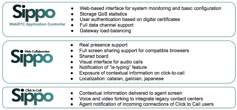 In addition, Sippo Web Collaborator and Sippo Click to Call applications provide a complete set of new functionalities (shared board, shared forms, etc.) that bring a real collaborative user experience. Contextual information is another new feature, allowing the other side to get information about the caller (location, type of browser, default language, etc.) that help to improve the quality of experience in different use cases. Meanwhile, the most popular feature is call forking, that makes possible to integrate a voice call with the existing infrastructure (i.e, ACD or legacy PBX in case of contact centers) while keeping video calls from browser to browser. This is the best way to add video and collaboration to existing audio platforms with minimal impact.