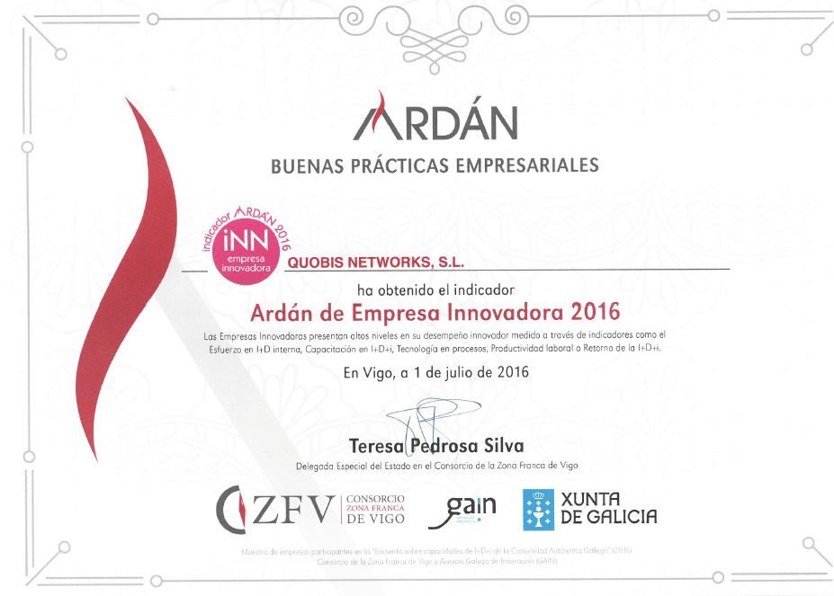 Quobis has been recognised in the Ardan 2016 report as one of the most innovative Galician companies. Quobis has achieved the Five-Star category in the Innovation ranking of the Economic and Competitiveness report made by “Zona Franca de Vigo” in conjunction with the Galician Innovation Agency and the University of Vigo.