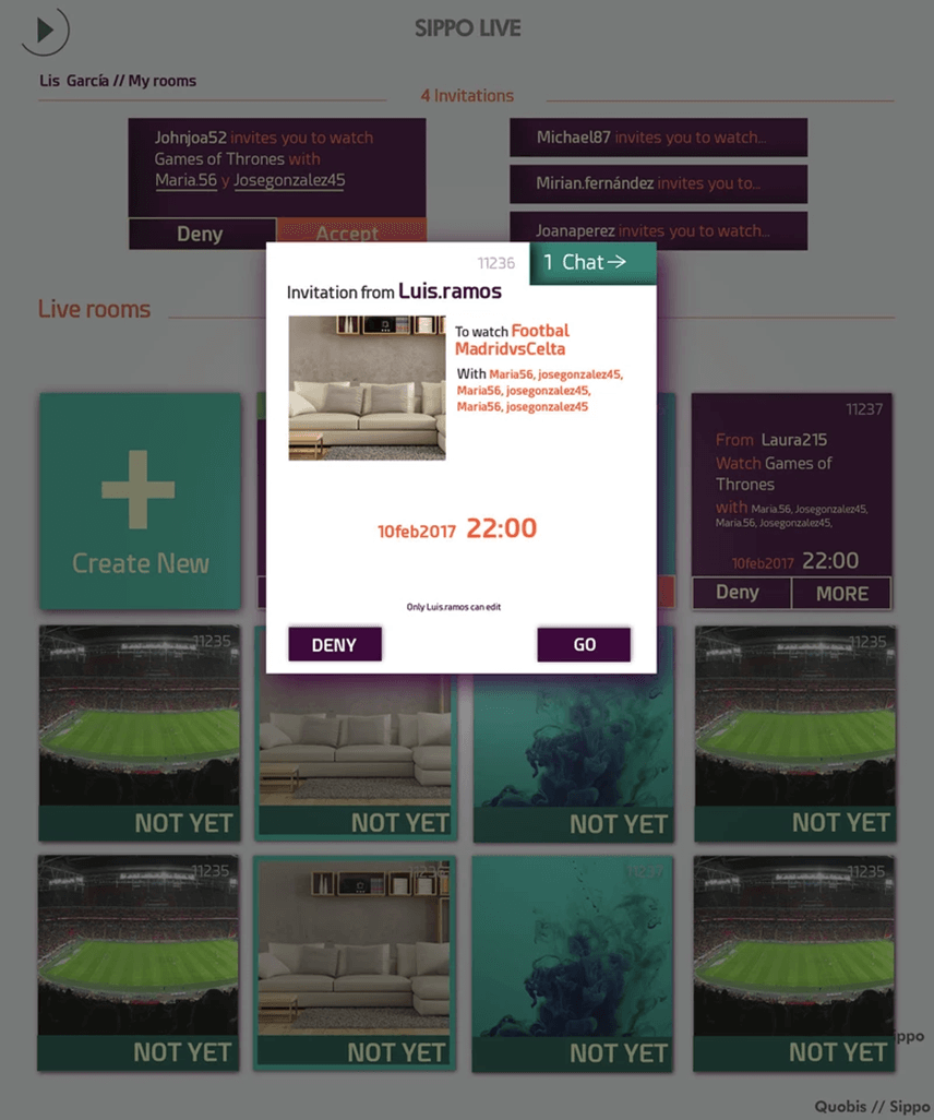 Quobis provides consulting services on WebRTC for telcos and services providers. This technology makes possible to add a communication and collaboration layer on web-based streaming services and existing mobile applications. Based on this technology Quobis has built Sippo WAC, an application server that enables different use cases of web communications, including those related with content streaming like the case of Social TV. Sippo includes features like group chat, push notifications, multi-conferencing and multi-device Support that make Social TV possible. Using Sippo Web Collaborator you can chat with your friends using any device and from any location, so you can invite them to join a room with a live streaming event using the web browser.
