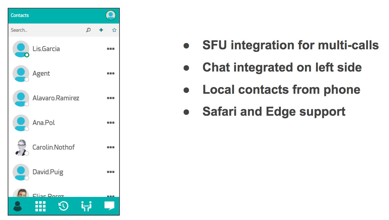 The meetings are now abstracted being able to use multiple notifications engines (SMS or e-mail). There anonymous rooms are a simpler way to create multi-party calls, the SFU engines with the QSS add-on makes the integration with group calls something natural and comfortable. Also, there are much more customization possibilities with the new interface. Another important element: the session persistence: reload the page and your user will be logged automatically.