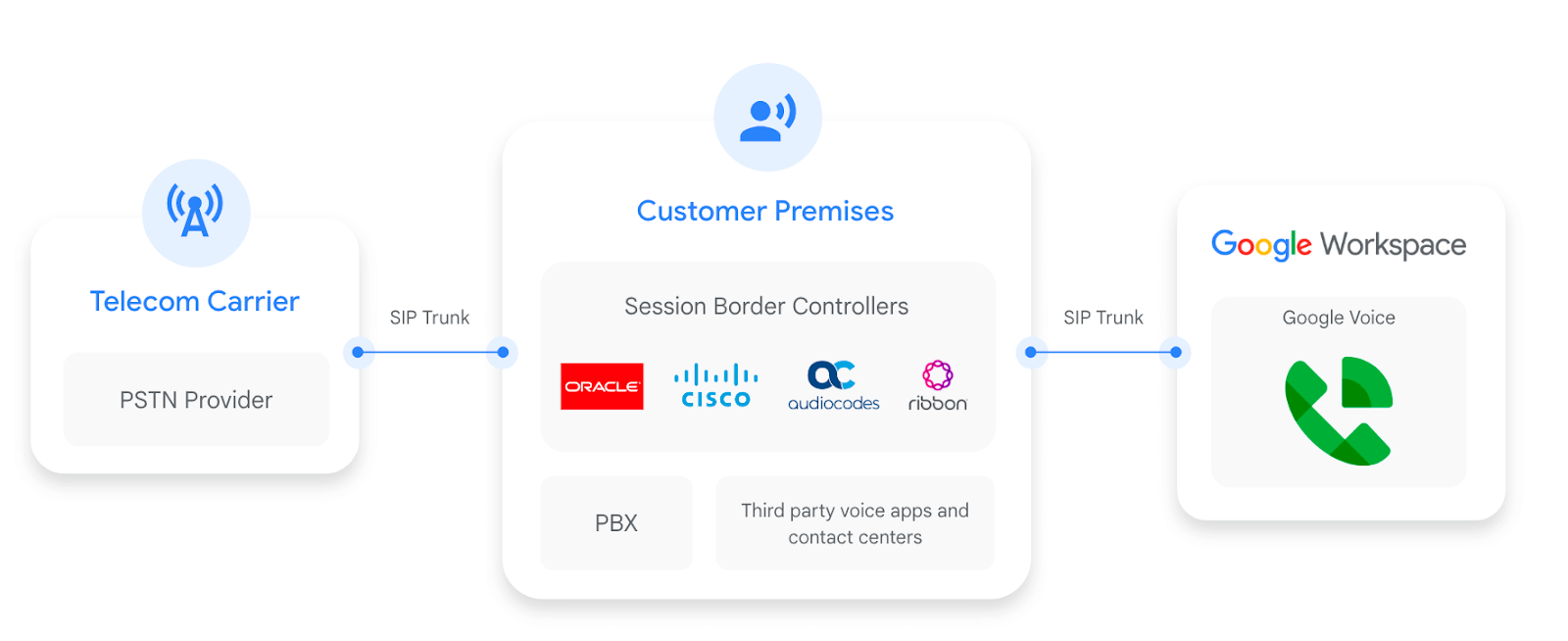 To do this, Session Border Controllers such as Oracle, Ribbon and Audiocodes have certified their SBCs and allow the connection of the corporate voice infrastructure (both carriers and other PBXs in the network) with Google telephony users.