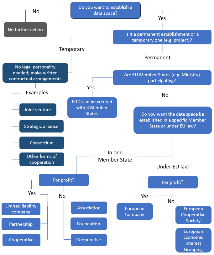 Existen varias formas legales a nivel de la Unión Europea que se ajustan a la necesidad de operar un Espacio de Datos como una entidad única en múltiples Estados miembros, ofreciendo la ventaja de la armonización regulatoria. Estas figuras están diseñadas para facilitar la colaboración transfronteriza y pueden ser adoptadas por la Autoridad de Gobierno del Espacio de Datos: